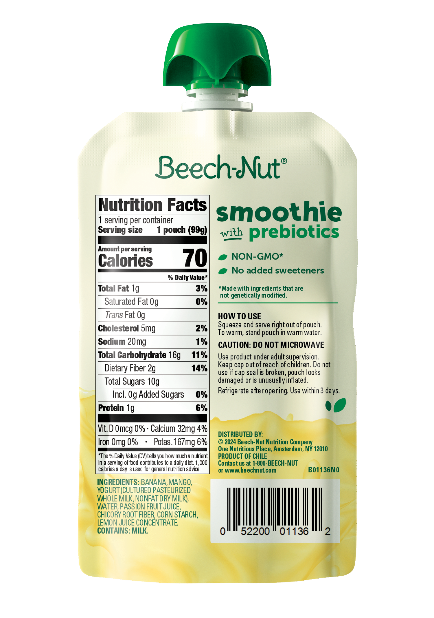 - Beech-Nut's delicious blend of banana, mango, passion fruit and whole milk yogurt
