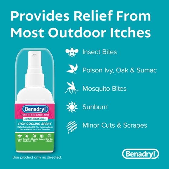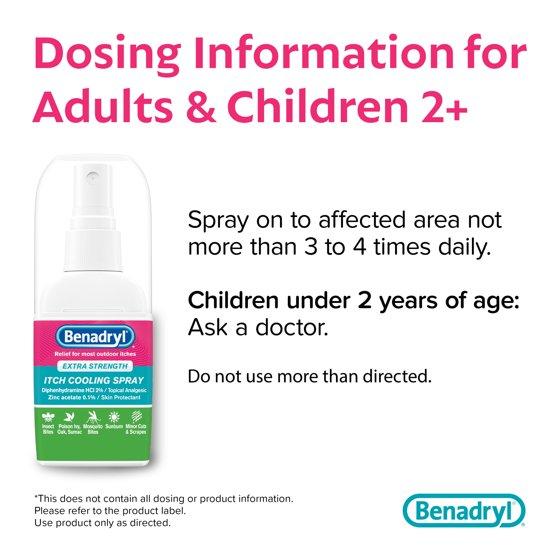Get relief from minor pain and skin itching caused by most outdoor itches with Benadryl Ex-tra Strength Itch Stopping Cooling Spray. Made with 2% diphenhydramine hydrochloride, a topical analgesic pain reliever, and 0.1% zinc acetate skin protectant, this topical anti-itch spray temporarily relieves itching associated with insect bites, minor burns, sunburn, minor skin irritations, minor cuts, scrapes and rashes due to poison ivy, poison oak and poison sumac. The soothing, extra strength topical itch spray dries the oozing and weeping of poi-son ivy, poison oak, and poison sumac. Extra Strength Benadryl Itch Stopping Topical Spray is intended for ages two and up and is great to keep in your travel first aid kit or on hand during outdoor activities such as camping, hiking or taking a walk with the family. Adults and children two years and older, apply the extra strength itch stopping topical analgesic spray to affected area no more than three to four times daily.