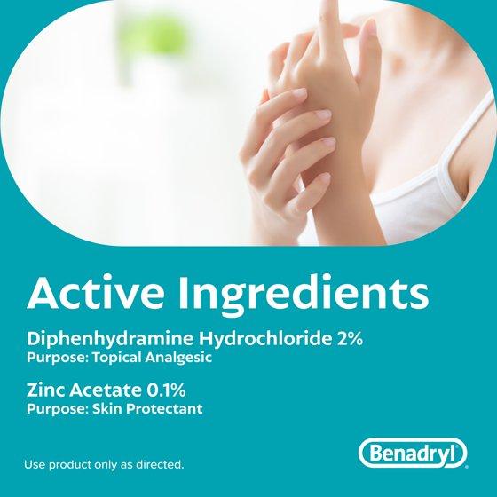 Active ingredients Diphenhydramine hydrochloride 2% Zinc acetate 0.1% Purpose Topical analgesic Skin protectant Inactive ingredients Cetyl alcohol, diazolidinyl urea, methylparaben, polyethylene glycol monostearate 1000, propylene glycol, propylparaben, purified water.