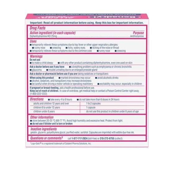 Allergies can hit fast. Get powerful relief with Benadryl Dye-Free Liqui-Gels Antihistamine Allergy Medicine that temporarily relieves the allergy symptoms associated with hay fever or other upper respiratory allergies caused by common allergens such as pollen, dust mites, mold and pet dander, as well as symptoms of the common cold. Free of dyes, each of these liquid gels contains 25 mg of the antihistamine diphenhydramine HCl to temporarily treat allergy symptoms such as sneezing, runny nose, itchy nose or throat, and itchy, watery eyes, and cold symptoms such as sneezing and runny nose. Effective relief day or night, this allergy medicine is safe and effective, when used as directed, and has a dye-free formula. From a doctor recommended brand, Benadryl liquid capsules are intended for adults and children ages six and up to relieve indoor and outdoor allergy symptoms and cold symptoms.