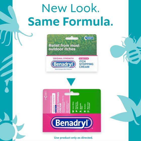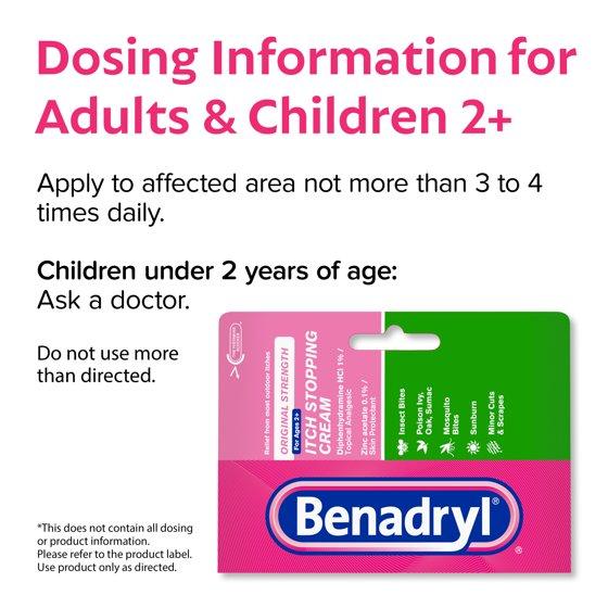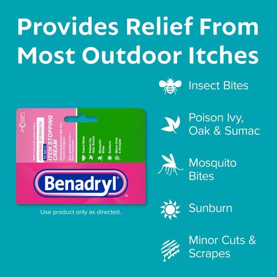 Benadryl Original-Strength Itch Stopping Anti-Itch Cream provides relief from minor pain and skin itching caused by most outdoor itches. Made with 1% diphenhydramine hydrochloride, a topical analgesic pain reliever, and 0.1% zinc acetate skin protectant, this topical cream temporarily relieves itching associated with insect bites, minor burns, sunburn, minor skin irritations, minor cuts, scrapes and rashes due to poison ivy, poison oak and poison sumac. The soothing itch cream dries the oozing and weeping of poison ivy, poison oak, and poison sumac. Original Strength Benadryl Itch Stopping Cream is intended for ages two and up and is great to keep on hand during outdoor activities such as camping, hiking or taking a walk with the family.