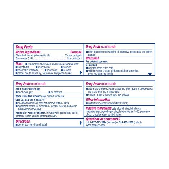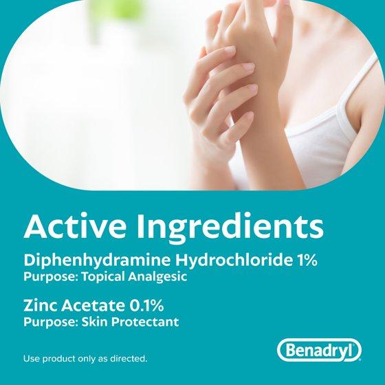 - Made with 1% diphenhydramine hydrochloride topical analgesic and 0.1% zinc acetate skin protectant