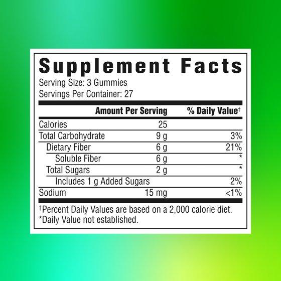 3 Gummies: Calories 25 Total Carbohydrate 9 g (3%*) (Dietary Fiber 6 g (21%*) [Soluble Fiber 6 g (**)], Total Sugars 2 g (**) [Includes Added Sugars 1 g (2%*)]) Sodium 15 mg (<1%*) * Percent Daily Values are based on a 2000 calorie diet **Daily Value not established Inulin (As Chicory Root Fiber) Soluble Corn Fiber Sugar Water Contains <2%: Annatto Seed Extract (Color) Citric Acid Fruit And Vegetable Juice Concentrates (Purple Carrot, Maqui Berry) (Color/Flavor) Monk Fruit Extract (Siraitia Grosvenorii) Natural Flavors Pectin Sodium Citrate Sunflower Oil