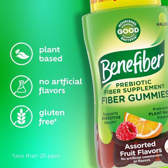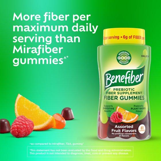 These assorted fruit prebiotic supplements are made with natural fruit flavors, supporting your digestive health with prebiotics that are convenient, easy to take on the go and great tasting (1). For ages 12 and above, chew 3 gummies up to twice daily. Do not exceed 6 gummies per day. Ages 6 and under ask your doctor. Benefiber makes taking fiber easy.