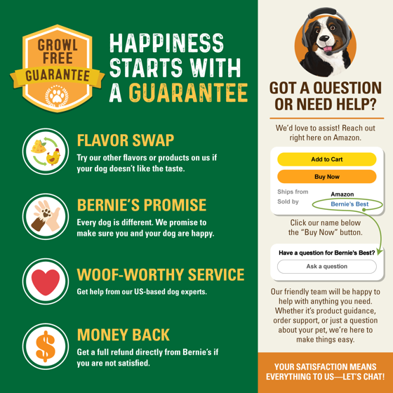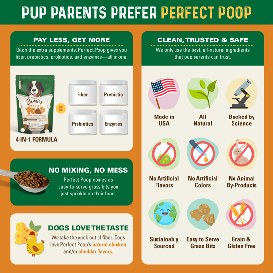 Bernie inspired it all—and we’ve been in your shoes. We know how hard it is when your dog isn’t feeling their best. That’s why every bag of Bernie’s Perfect Poop is made by dog parents, for dog parents.