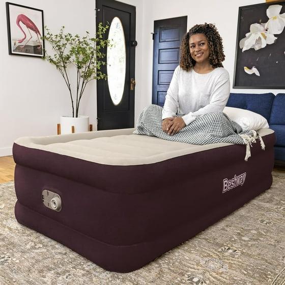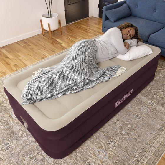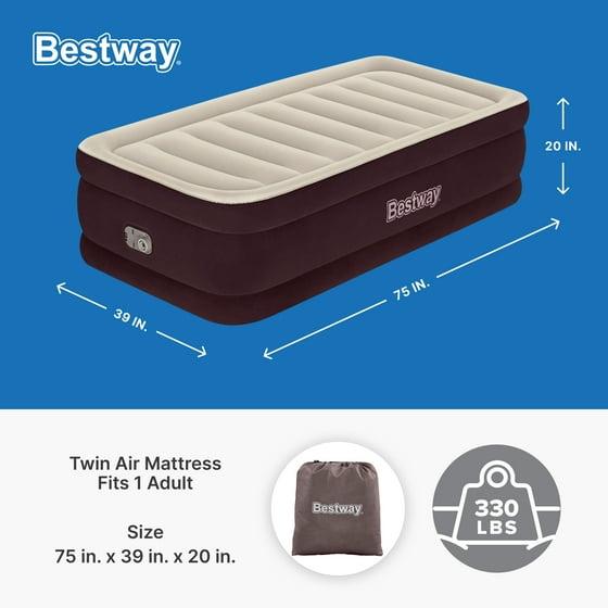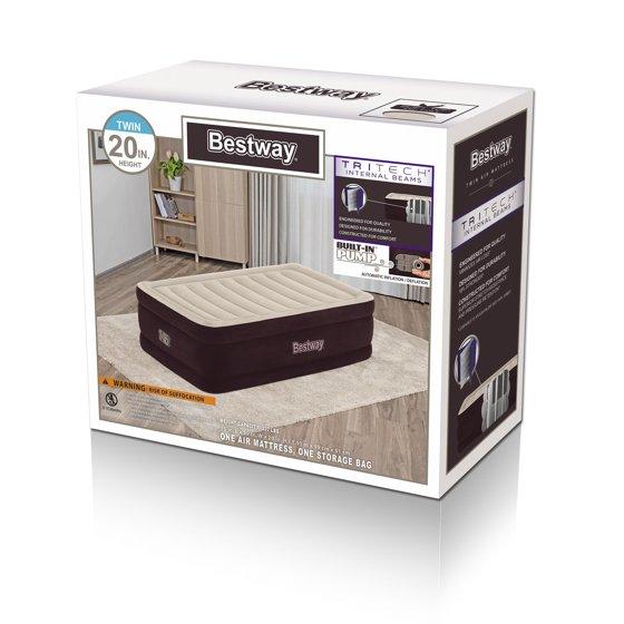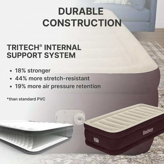 Wake up renewed and refreshed on the Bestway® Tritech® Air Mattress! This 20 in. tall, twin-sized bed promises strength, durability and comfort all night long. Its luxurious color, compact size and built-in pump make it quick and convenient for use whenever you need it. Durable Construction: With a comfortable sleeping surface and sturdy construction, a great night’s sleep is right around the corner. The internal structure of this bed is made with Tritech™ material offering durability and strength, while also allowing the mattress to keep the same shape no matter how many times it's inflated and deflated. Specifically engineered for firmness, this material minimizes air loss throughout the night. Tritech material increases internal stretch-resistance and provides contoured support for all night comfort. This durable, stress-tested material can withstand all of the weight and movement that comes with a great night’s sleep. Simple Setup: This air mattress inflates in 3 minutes so it is ready for bed when you are. The built-in pump allows for easy inflation, and the quick deflate screw valve allows for easy deflation after use. Simply place your flattened bed in the included carrying bag for easy transport and storage.