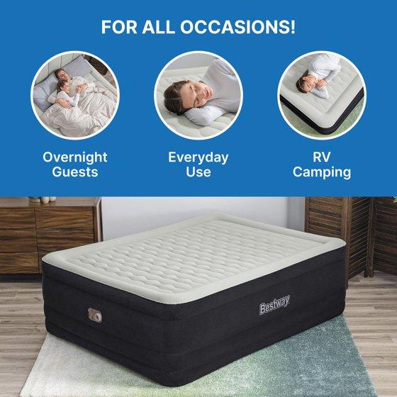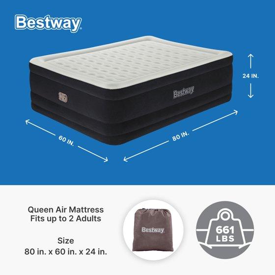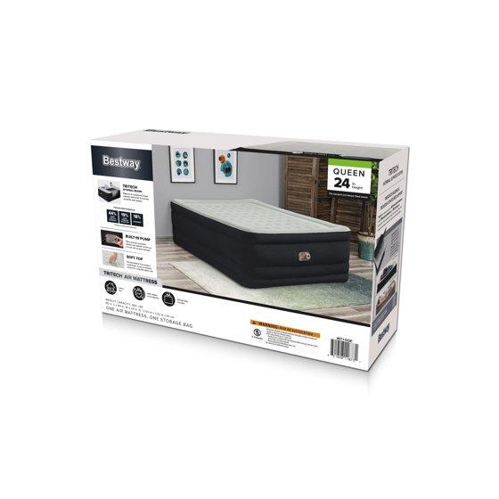 Wake up renewed and refreshed on the Bestway® Tritech® Air Mattress! This Queen-sized mattress promises strength, durability and comfort all night long. Its compact size and built-in pump make it quick and convenient for use whenever you need it. Durable Construction: With a comfortable sleeping surface and sturdy construction, a great night’s sleep is right around the corner. The internal structure of this mattress is made with Tritech material offering durability and strength, while also allowing the mattress to keep the same shape no matter how many times it's inflated and deflated. Specifically engineered for firmness, this material minimizes air loss throughout the night. Tritech material increases internal stretch-resistance and provides contoured support for all night comfort. This durable, stress-tested material can withstand all of the weight and movement that comes with a great night’s sleep. Simple Setup: This air mattress inflates in 5-6 minutes so it is ready for mattress when you are. The built-in pump allows for easy inflation, and the quick deflate screw valve allows for easy deflation after use. Simply place your flattened mattress in the included carrying bag for easy transport and storage.
