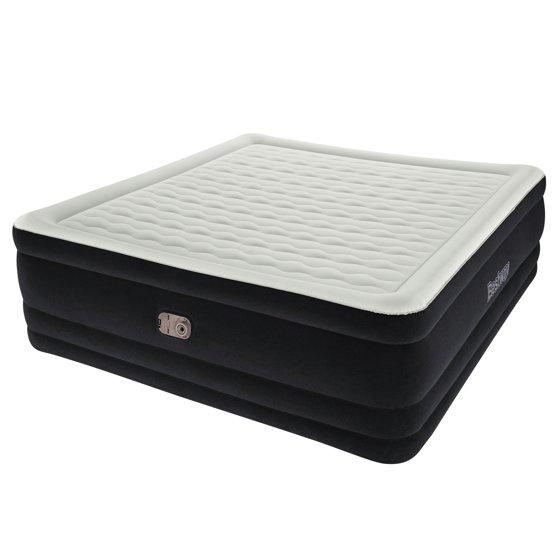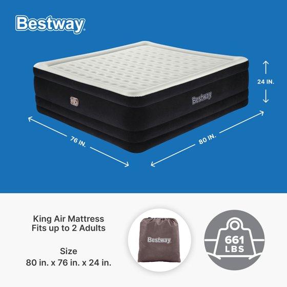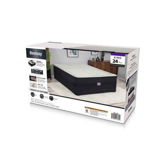Wake up renewed and refreshed on the Bestway® Tritech® Air Mattress! This King-sized mattress promises strength, durability and comfort all night long. Its compact size and built-in pump make it quick and convenient for use whenever you need it. Durable Construction: With a comfortable sleeping surface and sturdy construction, a great night’s sleep is right around the corner. The internal structure of this mattress is made with Tritech material offering durability and strength, while also allowing the mattress to keep the same shape no matter how many times it's inflated and deflated. Specifically engineered for firmness, this material minimizes air loss throughout the night. Tritech material increases internal stretch-resistance and provides contoured support for all night comfort. This durable, stress-tested material can withstand all of the weight and movement that comes with a great night’s sleep. Simple Setup: This air mattress inflates in 6-7 minutes so it is ready for mattress when you are. The built-in pump allows for easy inflation, and the quick deflate screw valve allows for easy deflation after use. Simply place your flattened mattress in the included carrying bag for easy transport and storage.