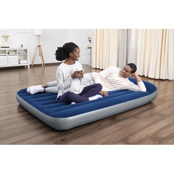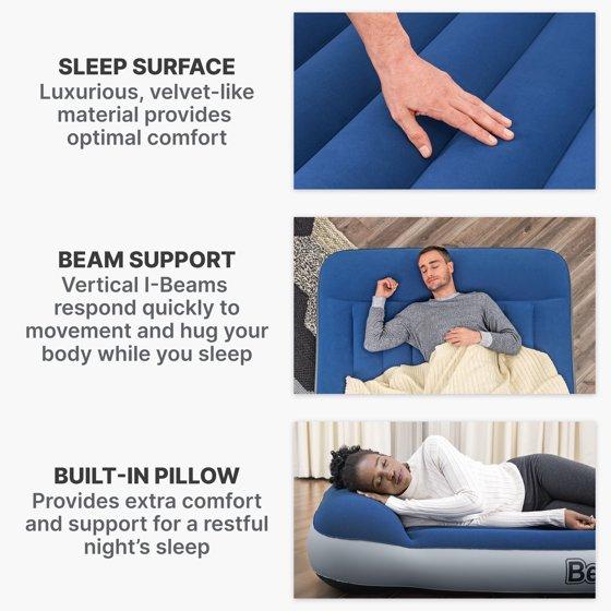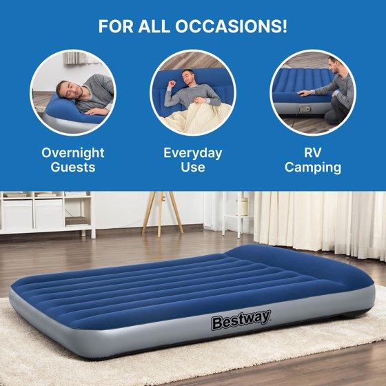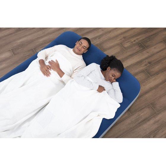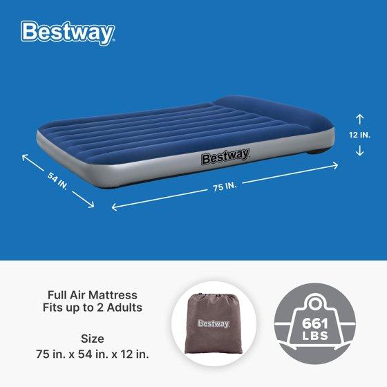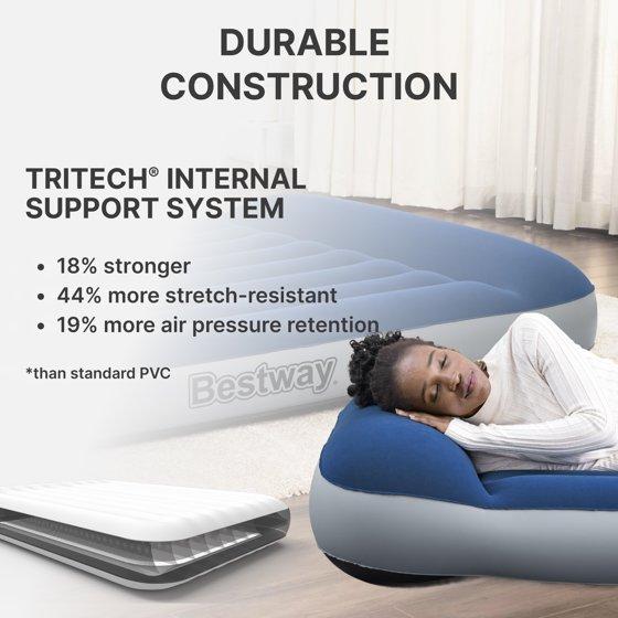 Wake up renewed and refreshed on the Bestway® Tritech® Air Mattress! This full-sized mattress promises strength, durability and comfort all night long. Its compact size and built-in pump make it quick and convenient for use whenever you need it. Durable Construction: With a comfortable sleeping surface and sturdy construction, along with a built-in pillow, a great night’s sleep is right around the corner. The internal structure of this mattress is made with Tritech™ material offering durability and strength, while also allowing the mattress to keep the same shape no matter how many times it’s inflated and deflated. Engineered for firmness, this material minimizes air loss throughout the night. This premium grade material increases internal stretch-resistance and provides contoured support for all night comfort. This durable, stress-tested material can withstand all of the weight and movement that comes with a great night’s sleep. Simple Setup: The built-in AC air pump inflates the mattress in 2-3 minutes, so it is ready for mattress when you are. In the morning, the quick deflate screw valve allows for easy deflation. Simply place your flattened mattress in the included carry bag for easy transport and storage.