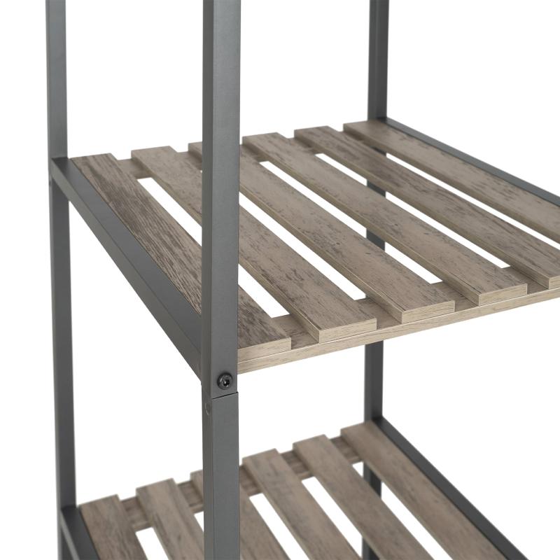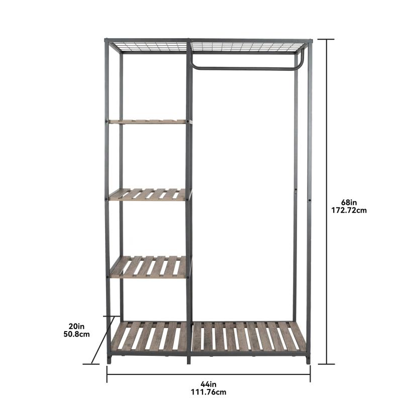 - Farmhouse Grey Wood and Metal Garment Rack with shelves and garment rod