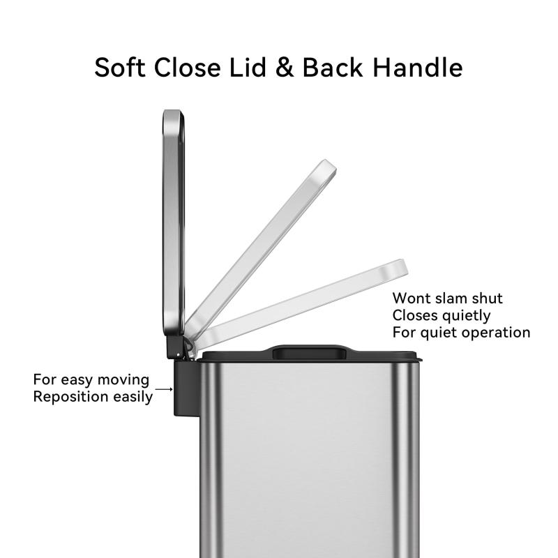 - Soft Close Lid Design: step-on garbage bin opens gently and closes quietly without clanging or slamming shut