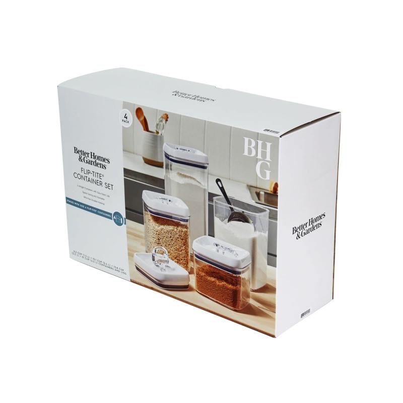 Keep your kitchen countertops organized with Better Homes & Gardens Flip-Tite® Food Storage Containers. It is a handy item to have in your kitchen or pantry. These food storage containers are great for storing dry foods, such as flour, dried beans, pasta, and more. They're made without Bisphenol-A (BPA) to ensure the safety of your food. The see-through container makes it easy to identify the contents at a glance without having to label each canister. Open them with ease and stack one or more on top of the other for space-saving storage. This 4 pack set includes 1 of 6.2-cup small square food storage container, 1 of 10.1-cup medium square food storage container, 1 of 13.8-cup large square food storage container, 1 of 19-cup square tall food storage container and 4 lids. Always wash before first use and remove seal from lid before wash. Allow all components to dry thoroughly before next use. Container and lid are dishwasher safe, the silicone seal is hand wash. Not Microwave safe. Do not carry Flip-Tite® Container by the lid.