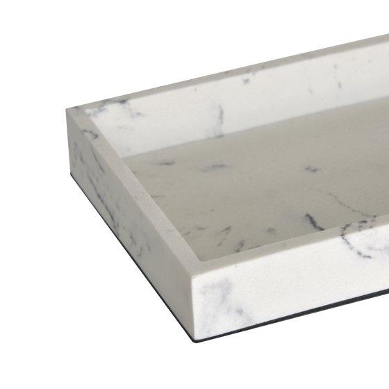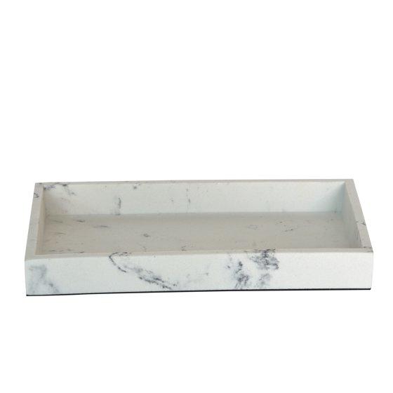 The Better Homes & Gardens Faux Marble Vanity Tray is perfect for organizing your bath vanity countertop, dresser or nightstand. This elegant tray can be used in a variety of ways. Use it for guest hand towels or decorative napkins. The sturdy tray is perfect for displaying your collection of perfume bottles or skincare essentials. The tray is also ideal for organizing make-up, watches, jewelry, headphones, eyeglasses, keys, and other small items. This tray sports raised sides that help keep your items neatly corralled away, leaving your countertop clean and clutter-free. The bottom of the tray is lined with a foam pad to protect your countertops or tables from scratches. Constructed of durable resin, the faux marble finish will add elegance to any décor and make the perfect addition to your counter. Shop the coordinating Faux Marble collection to complete the look. Wipe clean for easy care.
