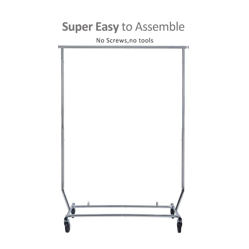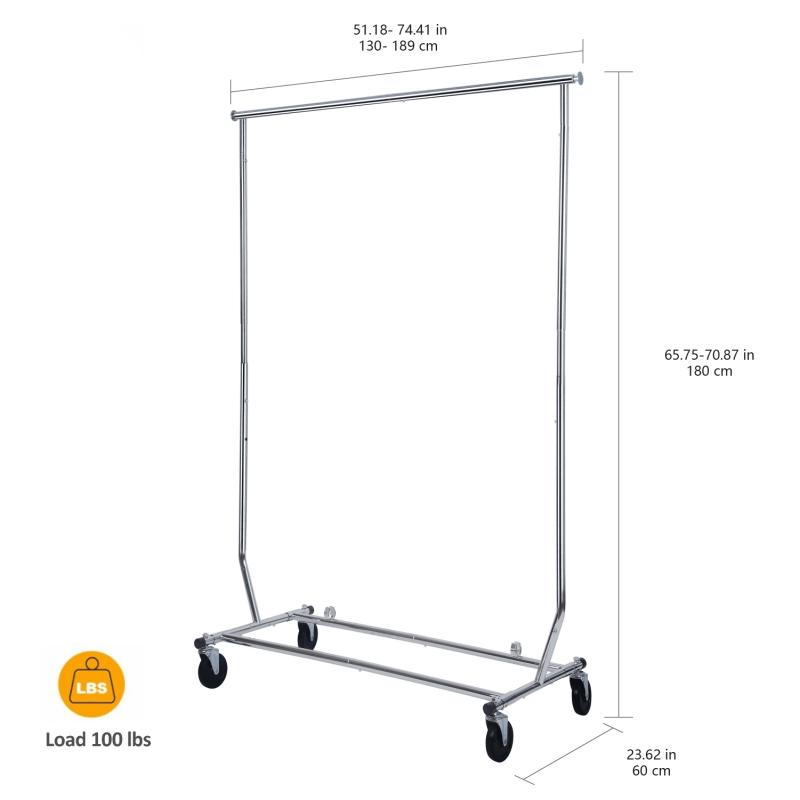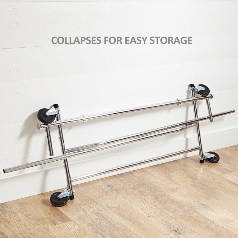 Give your closet an instant makeover with the Better Homes & Gardens Folding Adjustable Garment Rack. This organizer in chrome is the perfect storage solution for homes that aren't equipped with built-in closets. Enjoy the benefit of having tons of extra storage space to hang dresses, blouses, shirts, jackets, skirts, pants and more on the built-in hanging rod. Expand the rod to hold even more clothes and collapse it when necessary for simple and stress-free storage. It never been easier to transform your living space than with the Better Homes & Gardens Folding Adjustable Garment Rack, and the benefits are more than just a cleaner home.