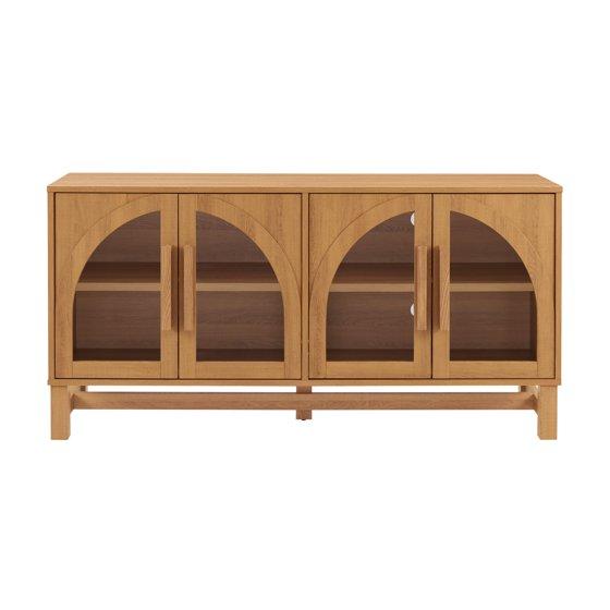 Elevate your entertainment center with the Better Homes & Gardens Juliet Arc TV Stand designed for flat-panel TVs up to 65 inches. Constructed with solid wood for lasting durability, its light honey finish adds a warm, inviting touch to any living room. The expansive console surface comfortably supports TVs up to 65 inches and 100 pounds, while four elegant, arched tempered glass doors provide stylish storage for media equipment and decorative accents. Each of the cabinet spaces contains an adjustable shelf that provides versatility for organizing your gadgets and accessories. Ideal for modern, contemporary, and minimalist décor, this high-quality TV stand combines refined design with practical functionality. The Juliet Arc TV Stand pairs beautifully with other pieces from the Juliet Collection from Better Homes & Gardens, including coffee tables, bookcases, and more.