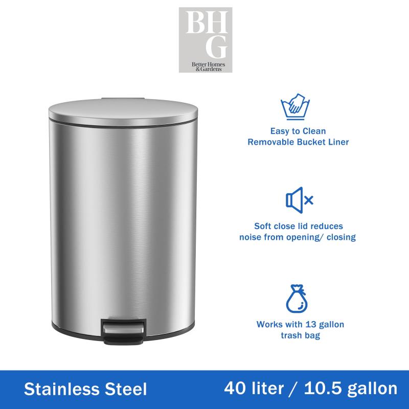 - Better Homes & Gardens Kitchen Trash Can, 10.5 Gallon Stainless Steel Oval Step Garbage Bin with Soft Close Lid, Silver