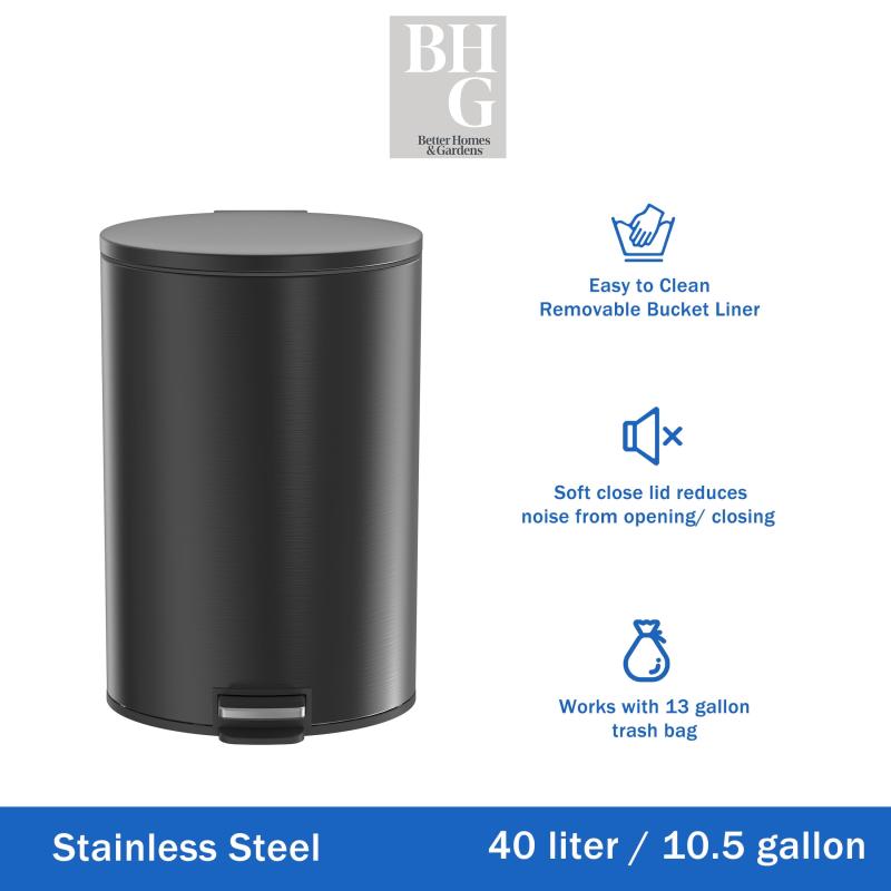 - Better Homes & Gardens Kitchen Trash Can, 10.5 Gallon Stainless Steel Oval Step Garbage Bin with Soft Close Lid, Silver
