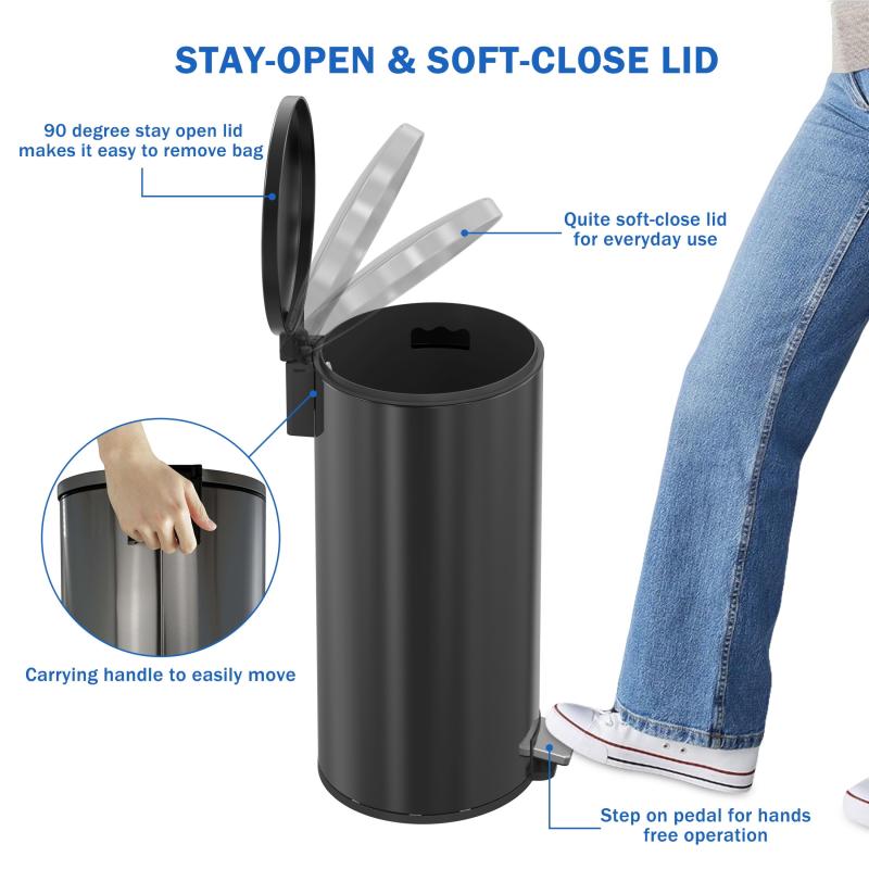 - Durable Step Pedal and Non-Slip Base: hands-free garbage bin pedal made from heavy-duty steel delivers reliable, long-lasting operation for years of daily use. touch-free operation promotes sanitary use in kitchens, bathrooms, offices, and high-traffic home spaces for the whole family. built-in non-slip pads keep the trash can stable on tile, wood, or carpet floors.
