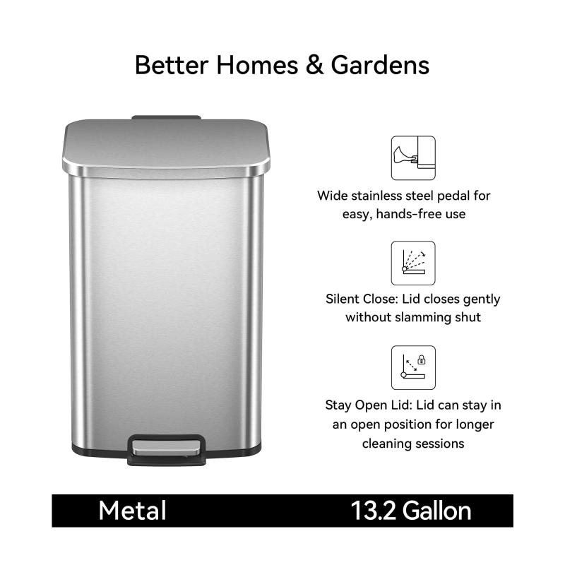 - Better Homes & Gardens Kitchen Trash Can, 13.2 Gallon Stainless Steel Step Garbage Bin with Soft Close Lid, Silver