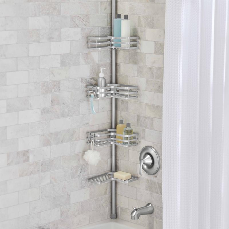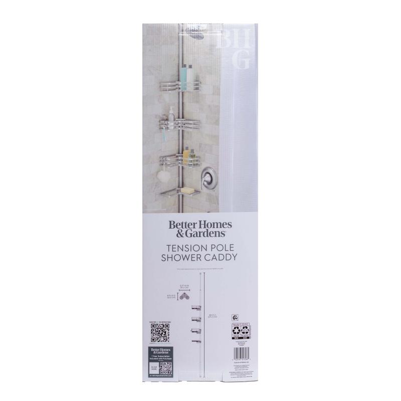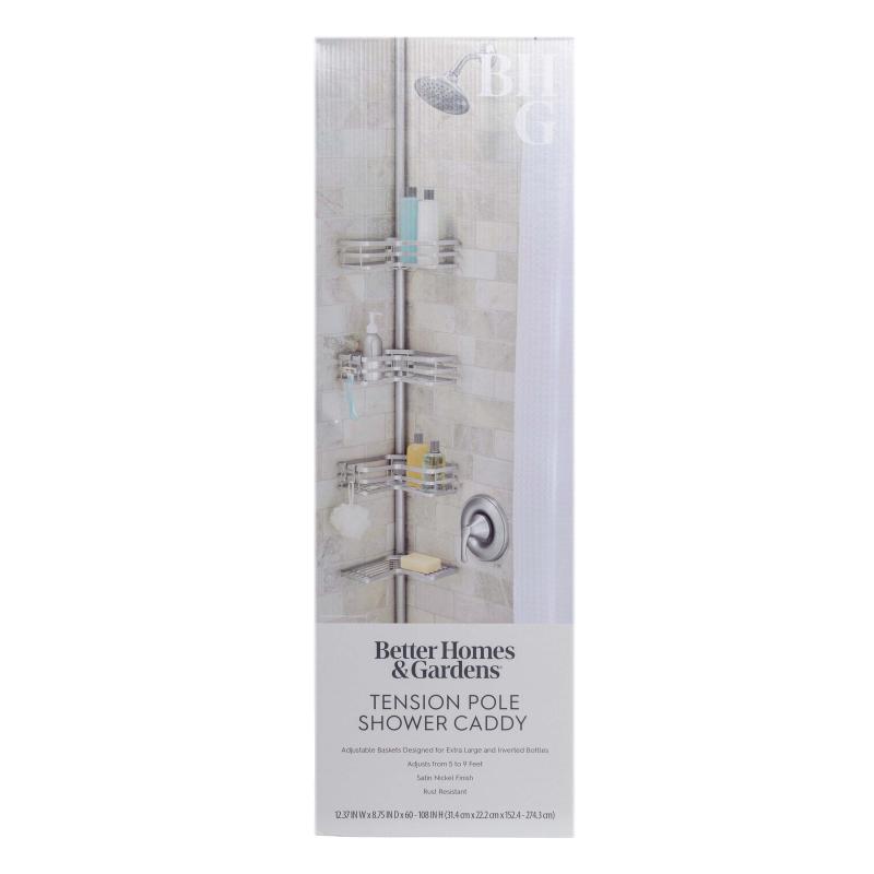 Better Homes & Gardens Adjustable Rust-Resistant Satin Nickel Tension Pole Shower Caddy, 3 Tier, 5-9 ft