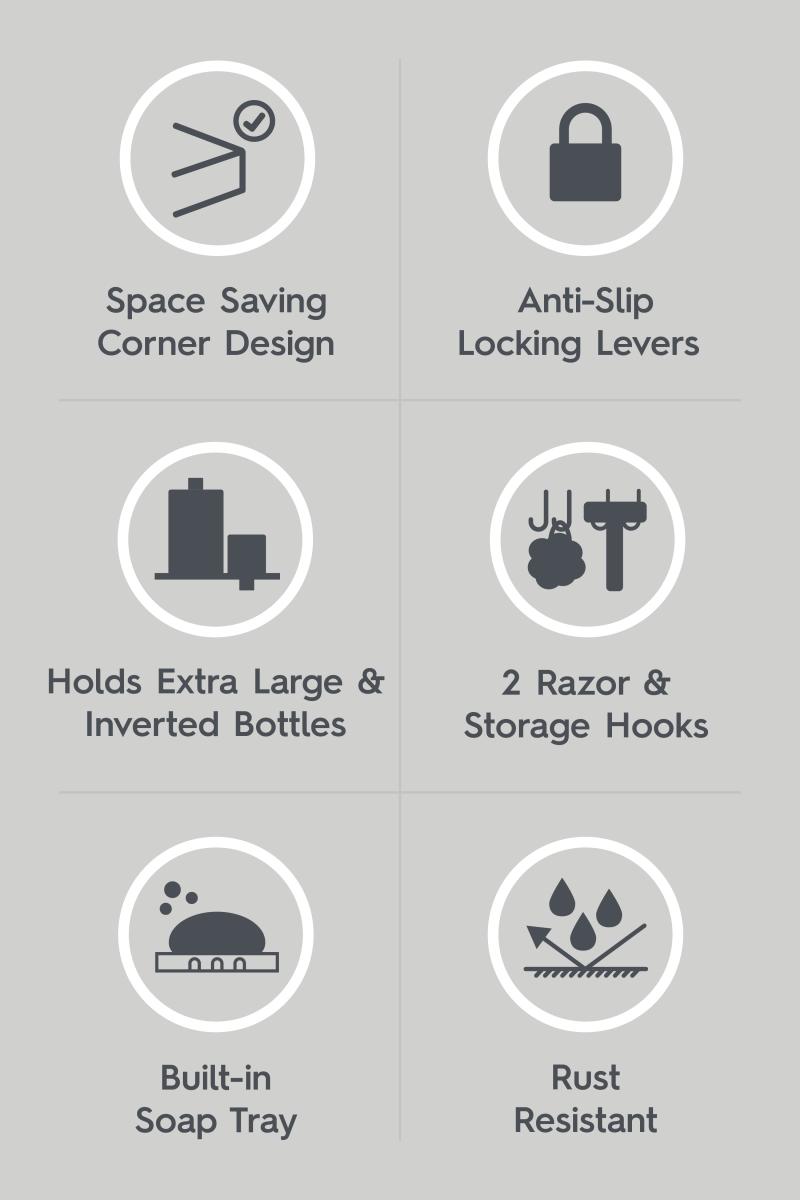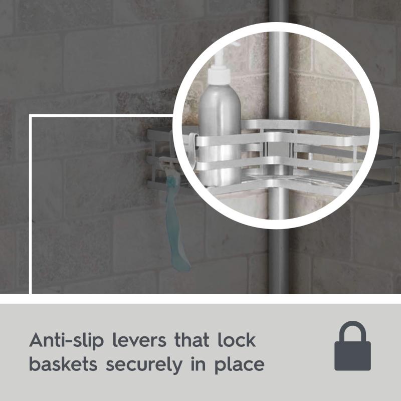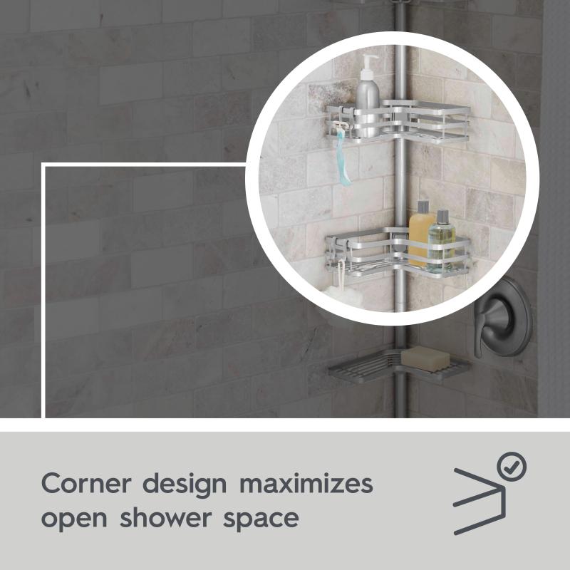 - L-shape storage baskets keep close to your walls to maximize open shower space; optional removable adhesive brace holds caddy securely in place near corner walls