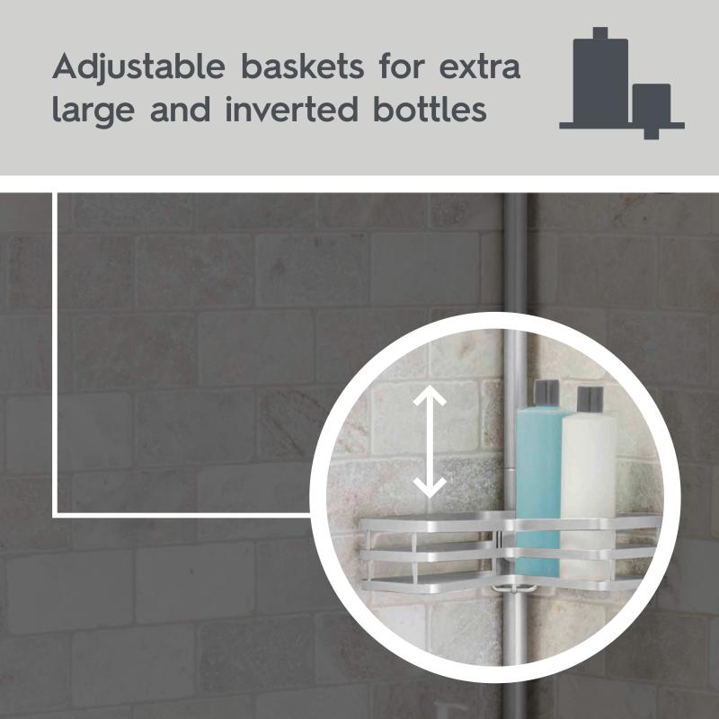 - Tension rod shower caddy has 3 storage baskets designed for extra large bottles