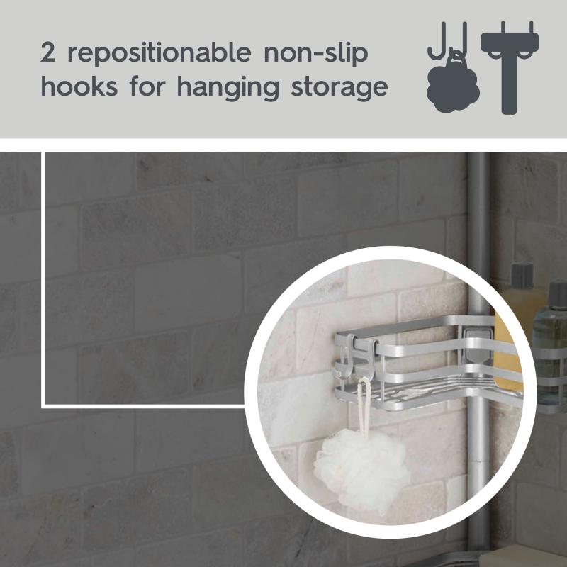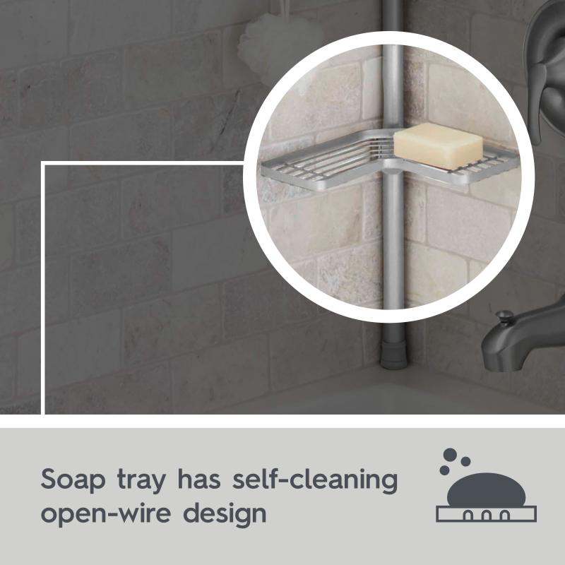 - Has 2 repositionable hooks for hanging storage, along with a soap tray with open wire design so soap dries quickly and doesn’t turn soft and gooey