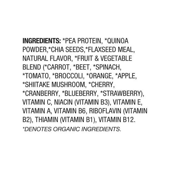 *Pea protein, *quinoa powder, *chia seeds, *flaxseed meal, natural flavor, *fruit & vegetable blend (*carrot, *beet, *spinach, *tomato, *broccoli, *orange, *apple, *shiitake mushroom, *cherry, *cranberry, *blueberry, *strawberry), vitamin C, niacin (vitamin B3), vitamin E, vitamin A, vitamin B6, riboflavin (vitamin B2), thiamin (vitamin B1), vitamin B12. *Denotes organic ingredients.