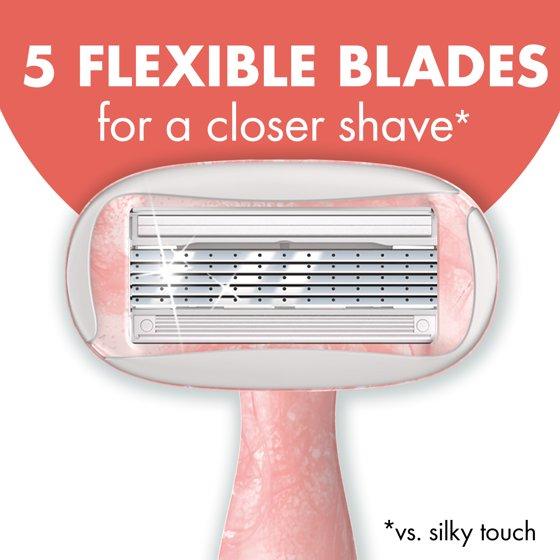 - FIVE BLADES: 5 flexible blades individually adjust to the contours of your skin even around knees, ankles, legs, armpits and bikini lines for a closer shave¹ ¹vs. BIC Silky Touch