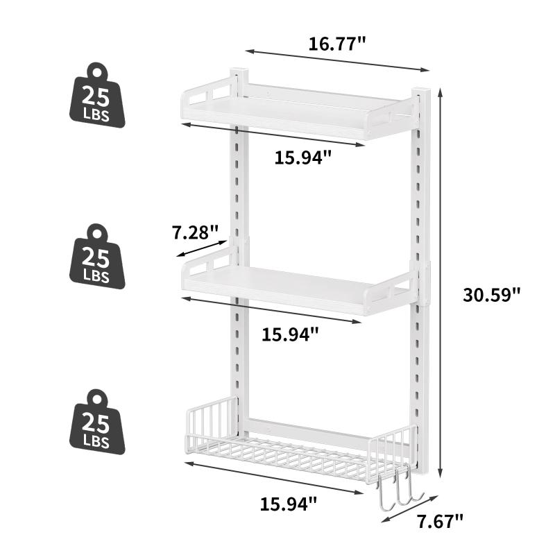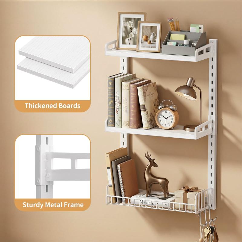 [Customizable Storage Solution]: Easily adjust the shelves and baskets along the two vertical metal tracks to suit your storage needs. Whether you're organizing toiletries, spices, books, or décor, this wall-mounted shelf provides a personalized and tidy storage solution. The side guardrails ensure everything stays securely in place, offering peace of mind while maximizing your space.