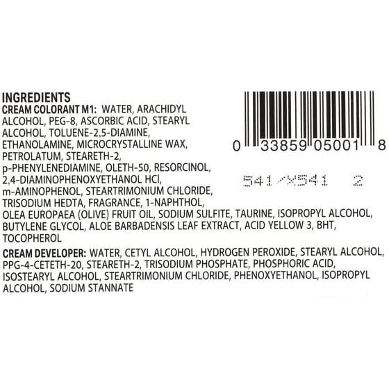 Cream Colorant M1: Water, Arachidyl Alcohol, PEG-8, Ascorbic Acid, Stearyl Alcohol, Toluene-2.5-Diamine, Ethanolamine, Cetyl Ethylhexanoate, Microcrystalline Wax, Steareth-2, P-Phenylenediamine, Oleth-50, Resorcinol, M-Aminophenol, Pentasodium Pentetate, P-Aminophenol, Fragrance, Steartrimonium Chloride, 2.6-Diaminopyridine, 2.4-Diaminophenoxyethanol HCl, Olea Europaea (Olive) Fruit Oil, Sodium Sulfite, Taurine, Sodium Hydroxide, Acid Yellow 3, Butylene Glycol, Aloe Barbadensis Leaf Extract, Methylparaben, Tocopherol. Cream Developer: Water, Cetyl Alcohol, Hydrogen Peroxide, Stearyl Alcohol, Stearyl Stearate, Dimethicone, Lanolin, Sodium Myristyl Sulfate, Beheneth-30, Behentrimonium Chloride, Phenoxyethanol, Etidronic Acid, Isopropyl Alcohol, Tetrasodium Etidronate.Cream Colorant M1: Water, Arachidyl Alcohol, PEG-8, Ascorbic Acid, Stearyl Alcohol, Toluene-2.5-Diamine, Ethanolamine, Cetyl Ethylhexanoate, Microcrystalline Wax, Steareth-2, P-Phenylenediamine, Oleth-50, Resorcinol, M-Aminophenol, Pentasodium Pentetate, P-Aminophenol, Fragrance, Steartrimonium Chloride, 2.6-Diaminopyridine, 2.4-Diaminophenoxyethanol HCl, Olea Europaea (Olive) Fruit Oil, Sodium Sulfite, Taurine, Sodium Hydroxide, Acid Yellow 3, Butylene Glycol, Aloe Barbadensis Leaf Extract, Methylparaben, Tocopherol. Cream Developer: Water, Cetyl Alcohol, Hydrogen Peroxide, Stearyl Alcohol, Stearyl Stearate, Dimethicone, Lanolin, Sodium Myristyl Sulfate, Beheneth-30, Behentrimonium Chloride, Phenoxyethanol, Etidronic Acid, Isopropyl Alcohol, Tetrasodium Etidronate.