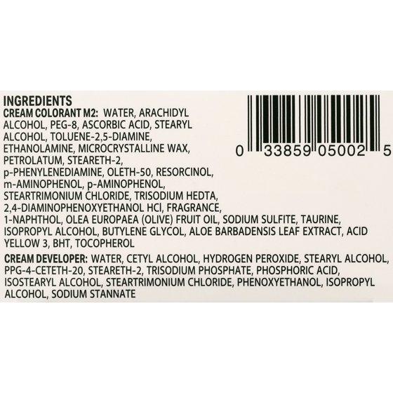 Ingredients Cream Colorant M2: Water, Arachidyl Alcohol, Peg-8, Ascorbic Acid, Stearyl Alcohol, Toluene-2, 5-diamine, Ethanolamine, Microcrystalline Wax, Petrolatum, Steareth-2, P-phenylenediamine, Oleth-50, Resorcinol, M-aminophenol, P-aminophenol, Steartrimonium Chloride, Trisodium Hedta, 2,4-diamino phenoxyethanol Hci, Fragrance, 1-Naphthol, Olea Europaea (Olive) Fruit Oil, Sodium Sulfite, Taurine, Isopropyl Alcohol, Butylene Glycol, Aloe Barbadensis Leaf Extract, Acid Yellow 3, Bht, Tocopherol Cream Developer: Water, Cetyl Alcohol, Hydrogen Peroxide, Stearyl Alcohol, Ppg-4-ceteth-20, Steareth-2, Trisodium Phosphate, Phosphoric Acid, Isostearyl Alcohol, Steartrimonium Chloride, Phenoxyethanol, Isopropyl Alcohol, Sodium Stannate