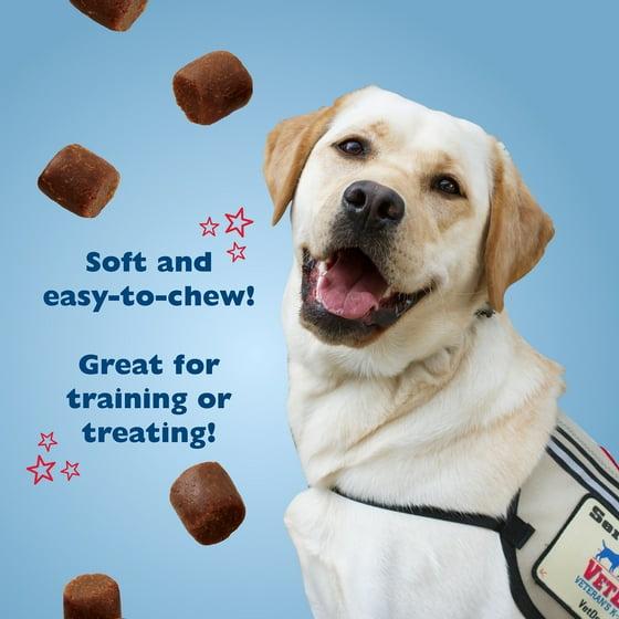 Bil-Jac VetDogs Veteran's K-9 Corps Training Treat for Dogs with peanut butter flavor are great for training and treating all sizes of dogs. These small sized treats provide a healthy treat option with less than 3 calories per treat. Made with delicious natural peanut butter flavor and real fresh chicken as the #1 ingredient for a taste dogs crave. Now you can train your dog with the same treat used to train assistance dogs for America's military heroes. These treats are the official training treat of the America's Vet Dog Organization that trains and provides assistance dogs to veterans, active-duty service members, and first responders with disabilities at no charge. These dogs allow our heroes to live honorably, and with dignity and independence. Your purchase will make a difference! Dog treat sales have helped raise over $2,000,000 to support this worthwhile cause.