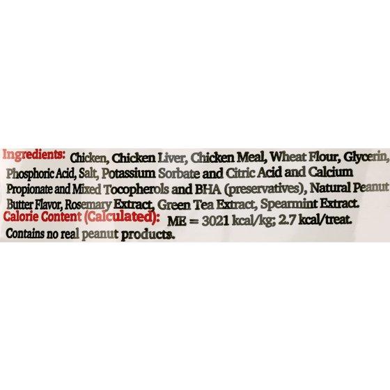Chicken, Chicken Liver, Chicken Meal, Wheat Flour, Glycerin, Phosphoric Acid, Salt, Potassium Sorbate and Citric Acid and Mixed Tocopherols and Calcium Propionate and BHA (preservatives), Natural Peanut Butter Flavor, Rosemary Extract.