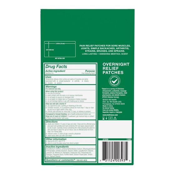 - KNEE PAIN RELIEF: Biofreeze Overnight Relief Patches with menthol-topical analgesic are designed to provide up to 8 hours of long-lasting pain.