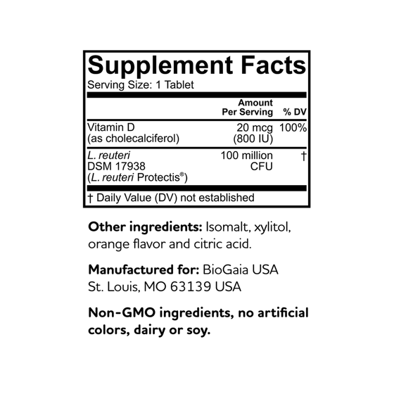 Isomalt, xylitol, Limosilactobacillus reuteri DSM 17938, vitamin D3, orange flavor, citric acid.