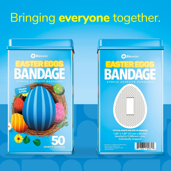 BioSwiss Bandages, Easter Egg Shaped Self Adhesive Bandage, Latex Free Sterile Wound Care, Fun First Aid Kit Supplies for Kids and Adults, 50 Count