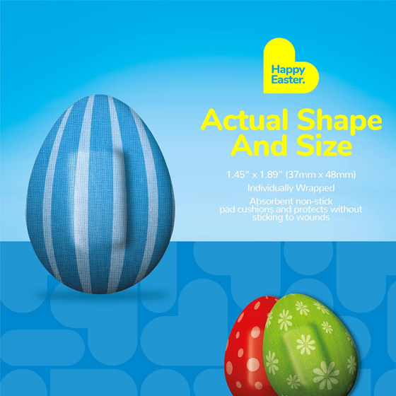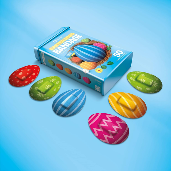 - EASTER EGG BANDAGES: This 50 piece tin of adorable Easter eggs bandages is great for putting a smile on kids' faces while protecting wounds such as cuts, scrapes, and burns, and come in 5 assorted styles; sticky bandages are perfect for kids and adults alike, and also for school nurses and pediatric doctors
