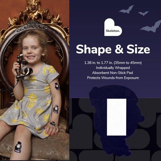 - SAFE PACKAGING: These sterile skeleton cartoon character bandages come in spooky packaging, and are individually wrapped for safe handling; small bandages help protect kids' sensitive wounds from coming into contact with dirt for first aid wound care