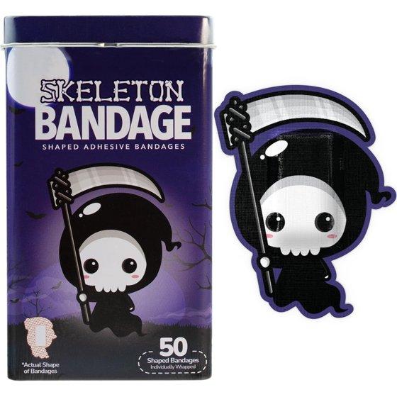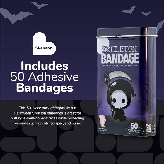 - SKELETON HALLOWEEN BANDAGES: This 50 piece tin of frightfully fun Halloween Skeleton bandages is great for putting a smile on kids' faces while protecting wounds such as cuts, scrapes, and burns; sticky bandages are perfect for kids and adults alike, and also for school nurses and pediatric doctors