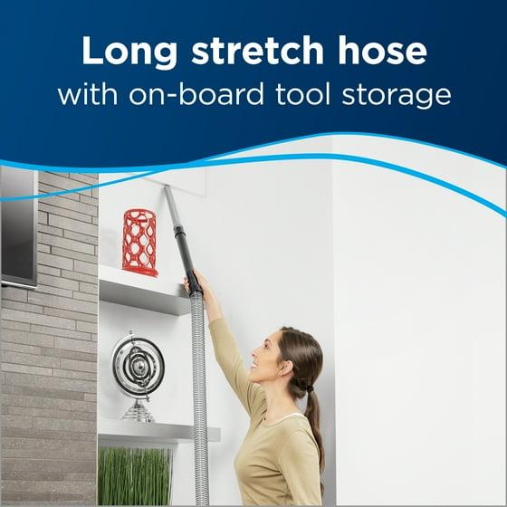 - On-board tool storage with long stretch hose