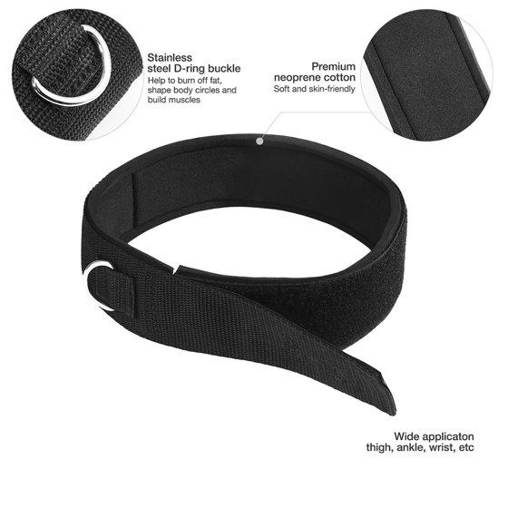 Durable nylon webbing with thick and neoprene padding. Thigh or ankle straps attachments for gym. Adjustable strong hook and loop fasteners closure-one size fits all. accessory straps fitness accessories with 2 D-ring.