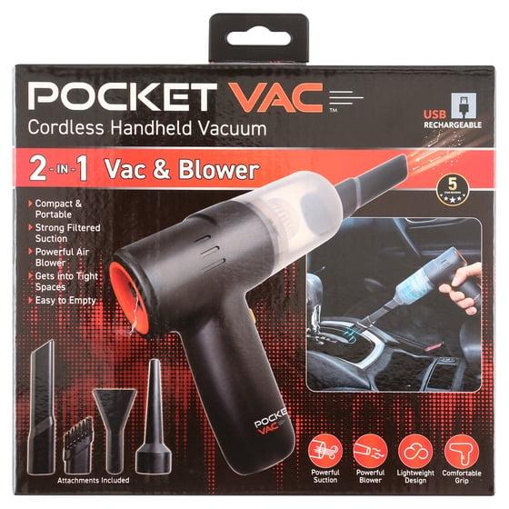 NEW! Pocket Vac Rechargeable Handheld Vacuum with Accessories - Cordless - Portable - As Seen on TV. This lightweight handheld vac with strong suction picks up dust, debris, and dirt from tight areas to larger surfaces. Makes spot-cleaning your home, work, or car area a breeze. Easy USB charging, no batteries needed. The compact design easily stores in a drawer, glove compartment, tool chest, etc. Includes 3 attachments, USB charging cable, and storage pouch. PVAC 12 oz.