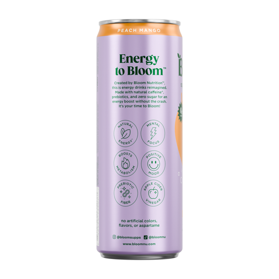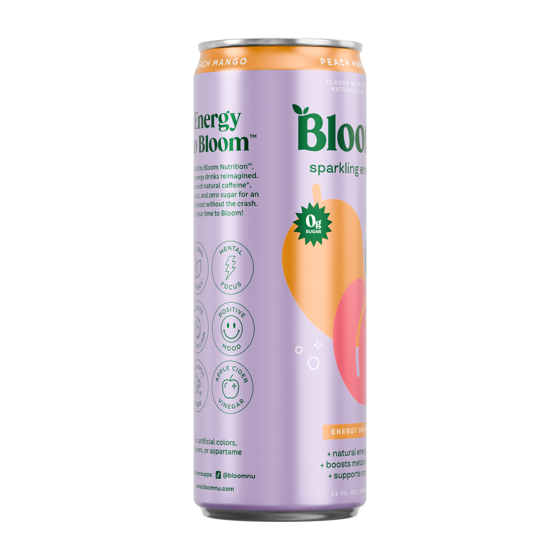 Bloom Nutrition Sparkling Energy Drink, Peach Mango, 12 fl oz Single Can