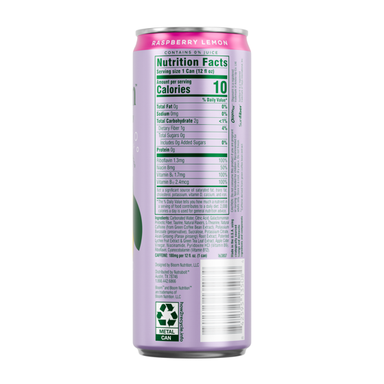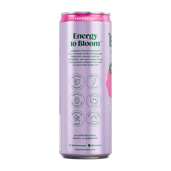 Bloom Nutrition Sparkling Energy Drink, Raspberry Lemon, 12 fl oz Cans, 6 Pack