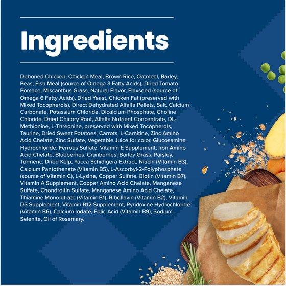 Deboned Chicken, Chicken Meal, Brown Rice, Oatmeal, Barley, Peas, Fish Meal (Source of Omega 3 Fatty Acids), Dried Tomato Pomace, Miscanthus Grass, Natural Flavor, Flaxseed (Source of Omega 6 Fatty Acids), Dried Yeast, Chicken Fat (Preserved with Mixed Tocopherols), Direct Dehydrated Alfalfa Pellets, Salt, Calcium Carbonate, Potassium Chloride, Dicalcium Phosphate, Choline Chloride, Dried Chicory Root, Alfalfa Nutrient Concentrate, DL-Methionine, L-Threonine, Preserved with Mixed Tocopherols, Taurine, Dried Sweet Potatoes, Carrots, L-Carnitine, Zinc Amino Acid Chelate, Zinc Sulfate, Vegetable Juice for Color, Glucosamine Hydrochloride, Ferrous Sulfate, Vitamin E Supplement, Iron Amino Acid Chelate, Blueberries, Cranberries, Barley Grass, Parsley, Turmeric, Dried Kelp, Yucca Schidigera Extract, Niacin (Vitamin B3), Calcium Pantothenate (Vitamin B5), L-Ascorbyl-2-Polyphosphate (Source of Vitamin C), L-Lysine, Copper Sulfate, Biotin (Vitamin B7), Vitamin A Supplement, Copper Amino Acid Chelate, Manganese Sulfate, Chondroitin Sulfate, Manganese Amino Acid Chelate, Thiamine Mononitrate (Vitamin B1), Riboflavin (Vitamin B2), Vitamin D3 Supplement, Vitamin B12 Supplement, Pyridoxine Hydrochloride (Vitamin B6), Calcium Iodate, Folic Acid (Vitamin B9), Sodium Selenite, Oil of Rosemary.