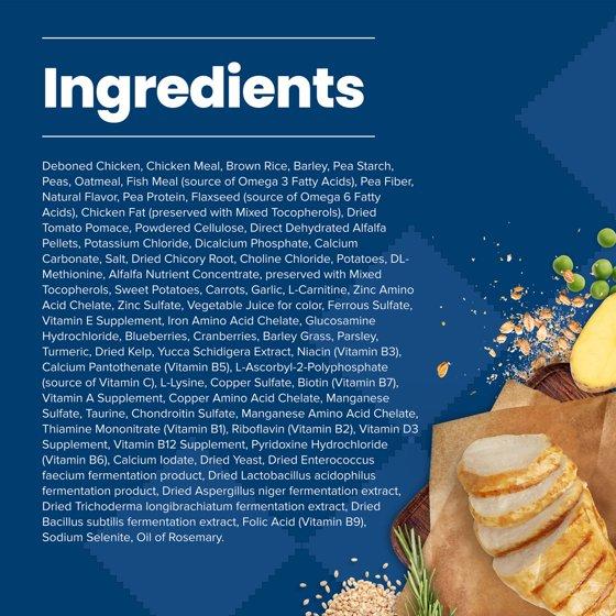 INGREDIENTS: Deboned Chicken, Chicken Meal, Brown Rice, Barley, Pea Starch, Peas, Oatmeal,Fish Meal (source of Omega 3 Fatty Acids), Pea Fiber, Natural Flavor, Pea Protein,Flaxseed (source of Omega 6 Fatty Acids), Chicken Fat (preserved withMixed Tocopherols), Dried Tomato Pomace, Powdered Cellulose, Direct DehydratedAlfalfa Pellets, Potassium Chloride, Dicalcium Phosphate,Calcium Carbonate, Salt, Dried Chicory Root, Choline Chloride, Potatoes,DL-Methionine, Alfalfa Nutrient Concentrate, preserved with Mixed Tocopherols,Sweet Potatoes, Carrots, Garlic, L-Carnitine, Zinc Amino Acid Chelate, ZincSulfate, Vegetable Juice for color, Ferrous Sulfate, Vitamin E Supplement, IronAmino Acid Chelate, Glucosamine Hydrochloride, Blueberries, Cranberries, BarleyGrass, Parsley, Turmeric, Dried Kelp, Yucca Schidigera Extract, Niacin (VitaminB3), Calcium Pantothenate (Vitamin B5), L-Ascorbyl-2-Polyphosphate (source ofVitamin C), L-Lysine, Copper Sulfate, Biotin (Vitamin B7), Vitamin A Supplement,Copper Amino Acid Chelate, Manganese Sulfate, Taurine, Chondroitin Sulfate,Manganese Amino Acid Chelate, Thiamine Mononitrate (Vitamin B1), Riboflavin(Vitamin B2), Vitamin D3 Supplement, Vitamin B12 Supplement, PyridoxineHydrochloride (Vitamin B6), Calcium Iodate, Dried Yeast, Dried Enterococcusfaecium fermentation product, Dried Lactobacillus acidophilus fermentationproduct, Dried Aspergillus niger fermentation extract, Dried Trichodermalongibrachiatum fermentation extract, Dried Bacillus subtilis fermentationextract, Folic Acid (Vitamin B9), Sodium Selenite, Oil of Rosemary. GUARANTEED ANALYSIS: Crude Protein 25 % min Crude Fat 10 % min Crude Fat 13 % max Crude Fiber 8 % max Moisture 10 % max Calcium 1.1 % min Phosphorus 0.8 % min Omega 3 Fatty Acids* 0.3 % min Omega 6 Fatty Acids* 2 % min L-Carnitine* 100 mg/kg min Glucosamine* 400 mg/kg min Chondroitin Sulfate* 300 mg/kg min *Not recognized as an essential nutrient by AAFCO Nutrient Profiles.
