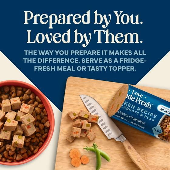 - Contains: One (1) 1-lb roll of BLUE Love Made Fresh Adult Dog Food, Chicken Recipe with Carrots and Peas