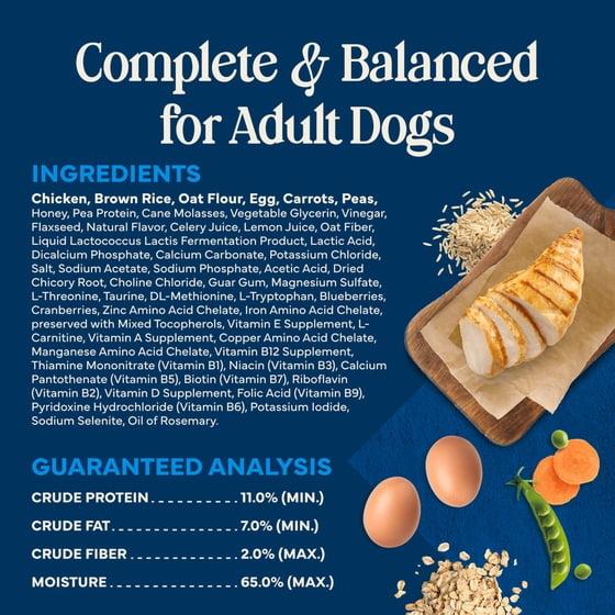 Ingredient: Chicken, Brown Rice, Oat Flour, Egg, Carrots, Peas, Honey, Pea Protein, Cane Molasses, Vegetable Glycerin, Vinegar, Flaxseed, Natural Flavor, Celery Juice, Lemon Juice, Oat Fiber, Liquid Lactococcus Lactis Fermentation Product, Lactic Acid, Dicalcium Phosphate, Calcium Carbonate, Potassium Chloride, Salt, Sodium Acetate, Sodium Phosphate, Acetic Acid, Dried Chicory Root, Choline Chloride, Guar Gum, Magnesium Sulfate, L-Threonine, Taurine, DL-Methionine, L-Tryptophan, Blueberries, Cranberries, Zinc Amino Acid Chelate, Iron Amino Acid Chelate, preserved with Mixed Tocopherols, Vitamin E Supplement, L-Carnitine, Vitamin A Supplement, Copper Amino Acid Chelate, Manganese Amino Acid Chelate, Vitamin B12 Supplement, Thiamine Mononitrate (Vitamin B1), Niacin (Vitamin B3), Calcium Pantothenate (Vitamin B5), Biotin (Vitamin B7), Riboflavin (Vitamin B2), Vitamin D Supplement, Folic Acid (Vitamin B9), Pyridoxine Hydrochloride (Vitamin B6), Potassium Iodide, Sodium Selenite, Oil of Rosemary. Guaranteed Analysis: Crude Protein 11.0% (min.), Crude Fat 7.0% (min.), Crude Fiber 2.0% (max.), Moisture 65.0% (max.).