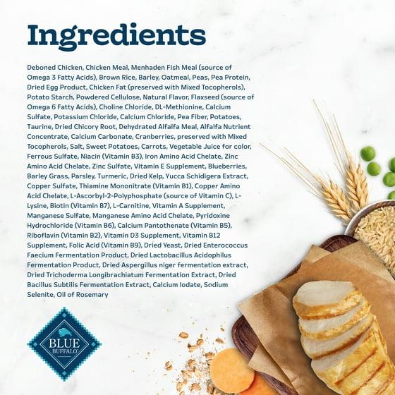 INGREDIENTS: Deboned Chicken, Chicken Meal, Menhaden Fish Meal (source of Omega 3 Fatty Acids), Brown Rice, Barley, Oatmeal, Peas, Pea Protein, Dried Egg Product, Chicken Fat (preserved with Mixed Tocopherols), Potato Starch, Powdered Cellulose, Natural Flavor, Flaxseed (source of Omega 6 Fatty Acids), Choline Chloride, DL-Methionine, Calcium Sulfate, Potassium Chloride, Calcium Chloride, Pea Fiber, Potatoes, Taurine, Dried Chicory Root, Dehydrated Alfalfa Meal, Alfalfa Nutrient Concentrate, Calcium Carbonate, Cranberries, preserved with Mixed Tocopherols, Salt, Sweet Potatoes, Carrots, Vegetable Juice for color, Ferrous Sulfate, Niacin (Vitamin B3), Iron Amino Acid Chelate, Zinc Amino Acid Chelate, Zinc Sulfate, Vitamin E Supplement, Blueberries, Barley Grass, Parsley, Turmeric, Dried Kelp, Yucca Schidigera Extract, Copper Sulfate, Thiamine Mononitrate (Vitamin B1), Copper Amino Acid Chelate, L-Ascorbyl-2-Polyphosphate (source of Vitamin C), L-Lysine, Biotin (Vitamin B7), L-Carnitine, Vitamin A Supplement, Manganese Sulfate, Manganese Amino Acid Chelate, Pyridoxine Hydrochloride (Vitamin B6), Calcium Pantothenate (Vitamin B5), Riboflavin (Vitamin B2), Vitamin D3 Supplement, Vitamin B12 Supplement, Folic Acid (Vitamin B9), Dried Yeast, Dried Enterococcus faecium fermentation product, Dried Lactobacillus acidophilus fermentation product, Dried Aspergillus niger fermentation extract, Dried Trichoderma longibrachiatum fermentation extract, Dried Bacillus subtilis fermentation extract, Calcium Iodate, Sodium Selenite, Oil of Rosemary. GUARANTEED ANALYSIS: Crude Protein 32.0% min. Crude Fat 15.0% min. Crude Fiber 6.0% max. Moisture 9.0% max. Magnesium 0.14% max. Taurine 0.15% min. Omega 3 Fatty Acids 0.5% min. Omega 6 Fatty Acids 2.5% min. *Not recognized as an essential nutrient by the AAFCO Cat Food Nutrient Profiles